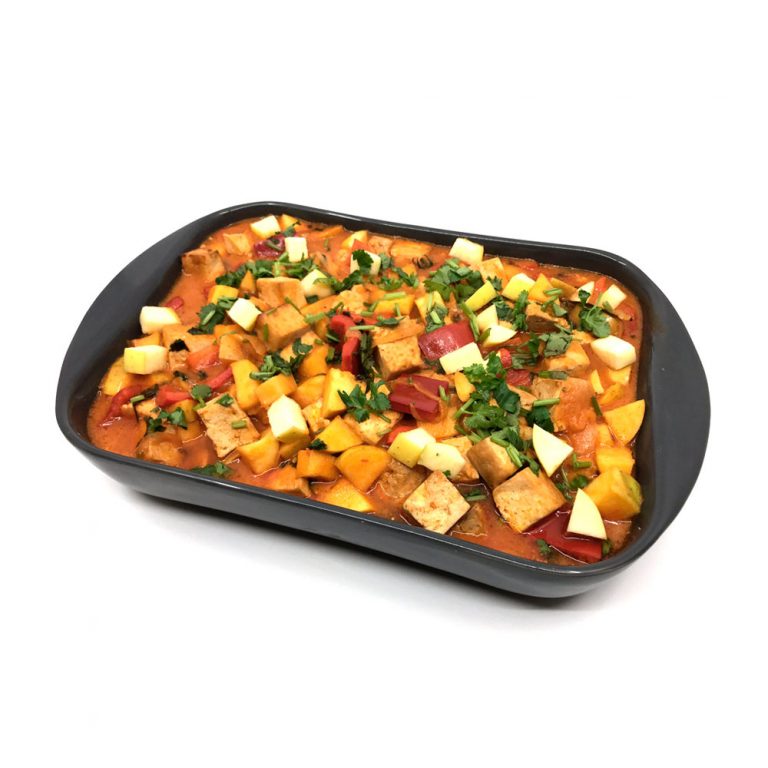 Ingredientes: TOFU (28%), Maçã Golden (16%), Tomate (14%), Cenoura (11%), Courgete (10%), LEITE DE CÔCO (7%), Pimento Vermelho, Cebola, Pasta de Alho, SHOYU, Gengibre, Coentros Frescos, Açafrão das Indias, Caril em Pó, Sal Marinho, Canela em Pau, Piri-Piri Moído, Louro Folha